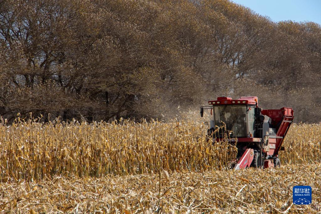 10月18日,在通遼市奈曼旗新鎮大代村,農機手操作收割機在田間收獲玉米。