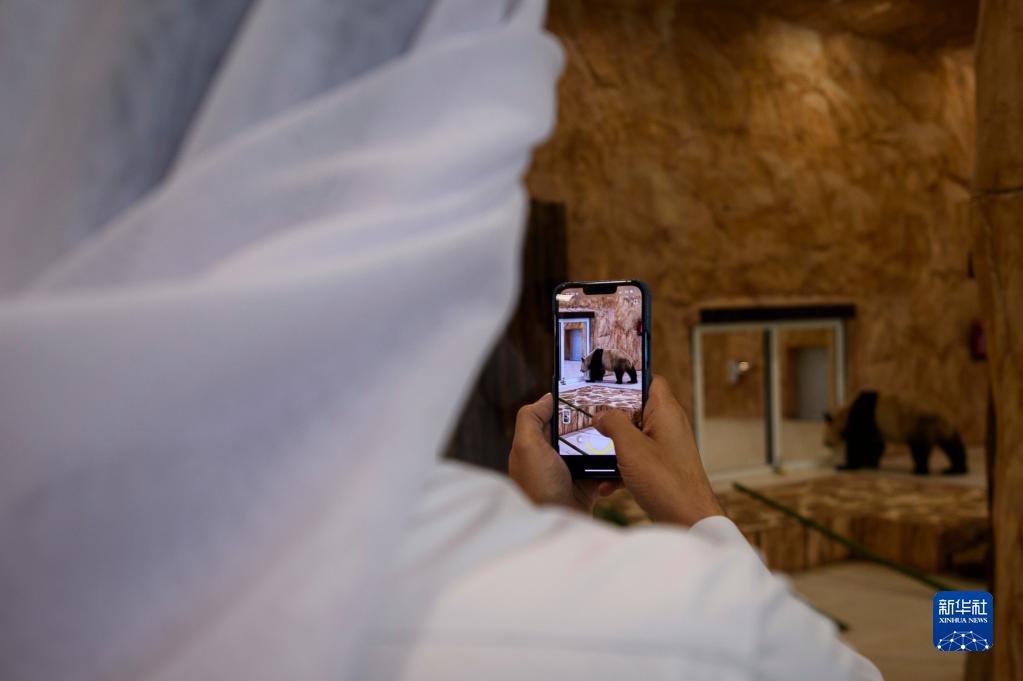 10月19日,一名男子在卡塔爾首都多哈的豪爾熊貓館拍攝大熊貓。新華社發(尼庫攝)