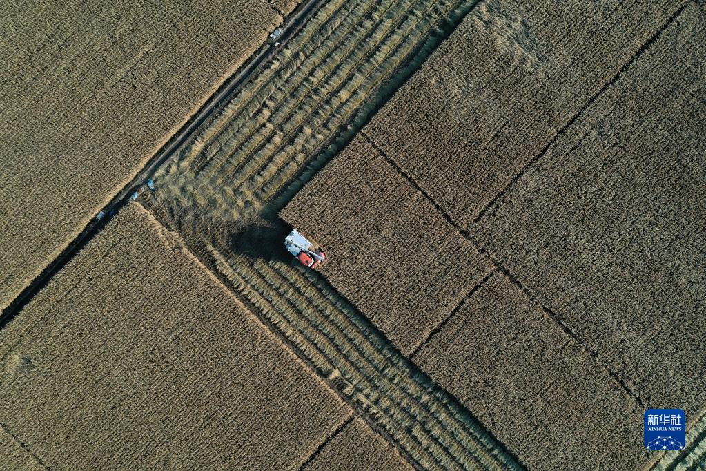 10月19日,在沈陽市蘇家屯區紅菱街道北紅村,村民駕駛收割機收割水稻(無人機照片)。