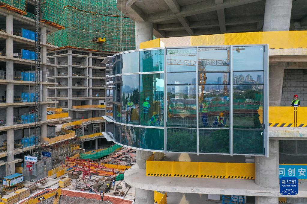 由中建深裝承建的央企中國電子總部大廈進入幕墻同步安裝階段,技術人員在對首片弧面幕墻玻璃進行放線測量(10月19日攝)。