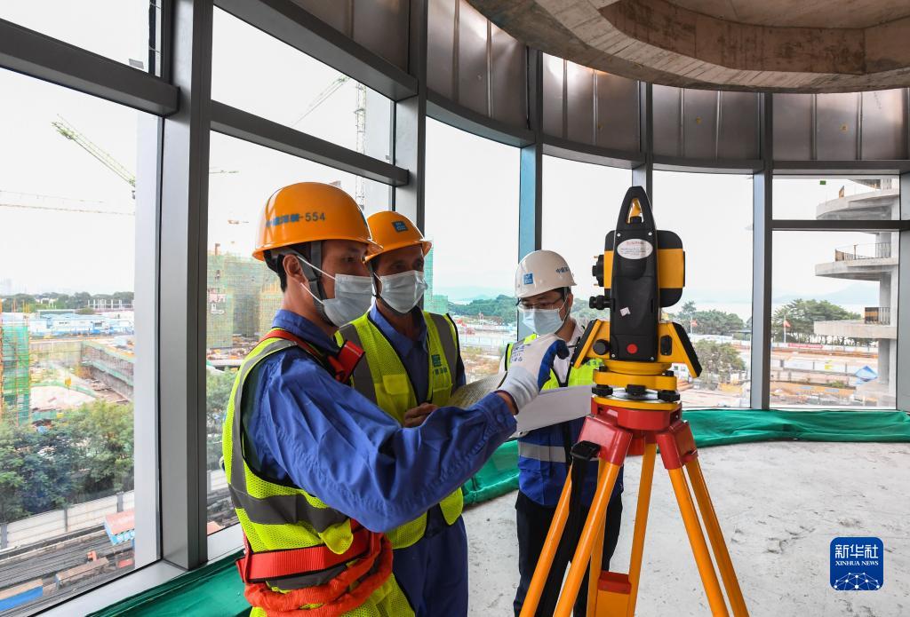 由中建深裝承建的央企中國電子總部大廈進入幕墻同步安裝階段,技術人員在對首片弧面幕墻玻璃進行放線測量(10月19日攝)。