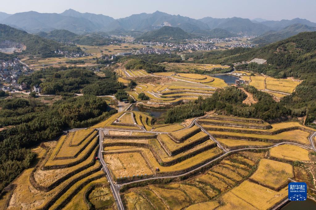 10月19日拍攝的杭州市富陽區新登鎮潘堰村的梯田水稻(無人機照片)。該村通過對低丘緩坡實施土地整理,建造梯田,同時采用防滲水膜節水法,建成了300畝左右“海綿農田”,雨季降水可以蓄積到農田下的地下隱形水庫供調劑使用。