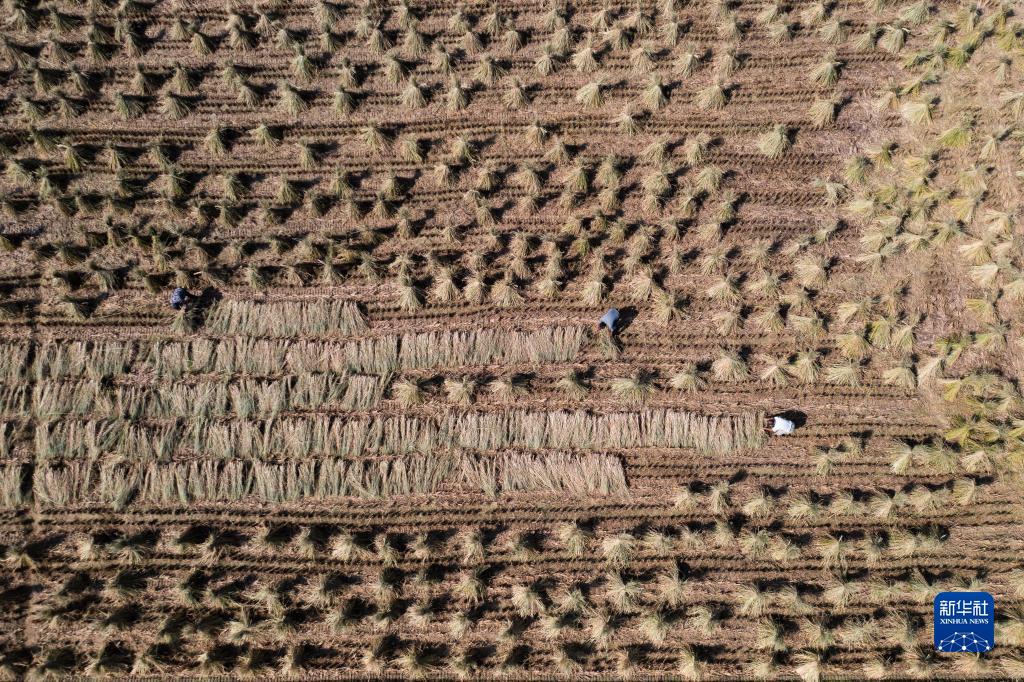 10月19日,種植戶在杭州市富陽區漁山鄉糧食生產功能區的稻田內捆扎秸稈(無人機照片)。漁山鄉糧食生產功能區毗鄰富春江,面積1700余畝,采取統一品種布局、統一測土配方、統一機插、統一病蟲害防治、統一機收、統一信息發布的“六統一”栽培技術,成為富陽成效顯著的糧食生產示范基地之一。