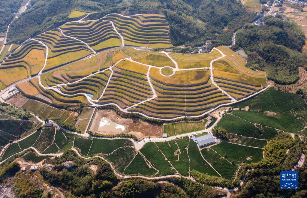 10月19日拍攝的杭州市富陽區永昌鎮藍田灣的梯田水稻。這片梯田是由荒山改造建成的“海綿農田”,雨季降水可以蓄積到農田下的地下隱形水庫供調劑使用(無人機照片)。