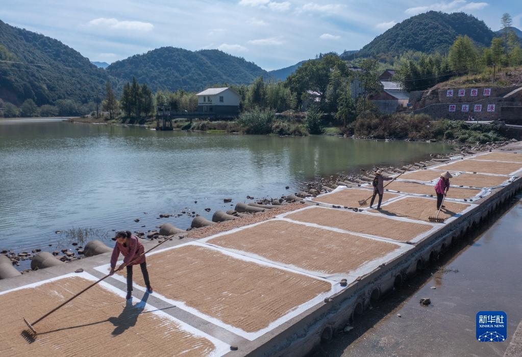 10月20日,杭州市富陽區湖源鄉石龍村的農民在壺源溪畔晾曬收獲的稻谷(無人機照片)。