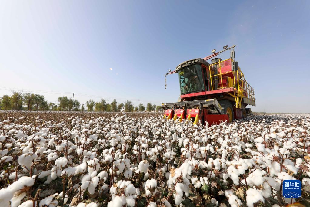在新疆巴音郭楞蒙古自治州尉犁縣興平鎮巴西阿瓦提村的一塊棉田里,國產采棉機在采收棉花(10月14日攝)。