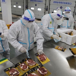當日,第五屆進博會的第一批進口冷鏈食品展品,運抵位于上海青浦區的名聯冷鏈第五屆進博會進口冷鏈食品總倉。在接下來的10天內,預計約3000箱冷鏈食品展品,將在總倉集中完成最小包裝消毒和核酸檢測。