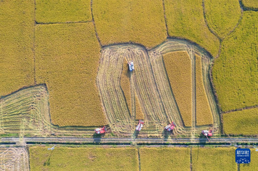 10月20日,在湖南省常德市鼎城區謝家鋪鎮,農民駕駛農機收割晚稻(無人機照片)。