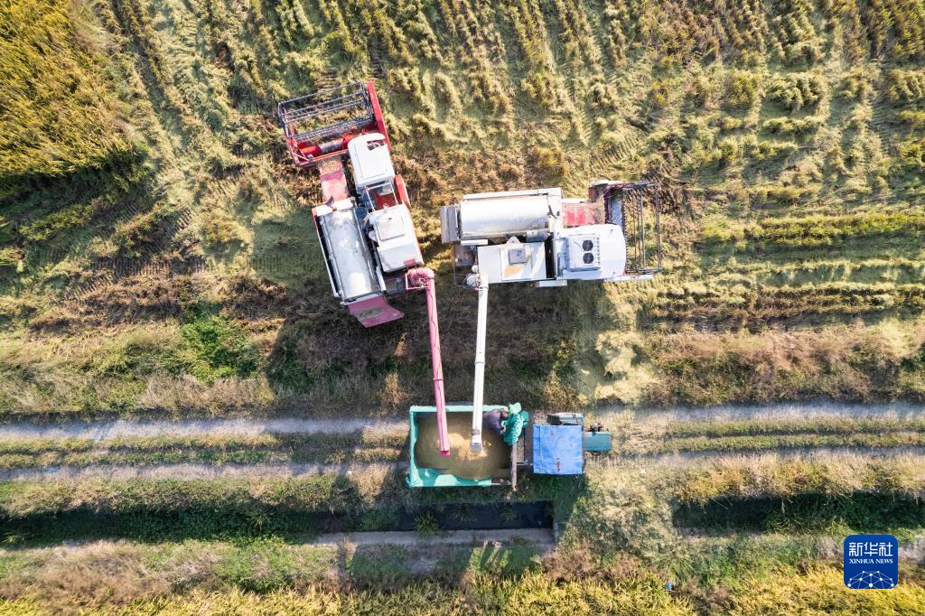 10月20日,在湖南省常德市鼎城區謝家鋪鎮,收割機把收好的稻谷轉放到運輸車里(無人機照片)。