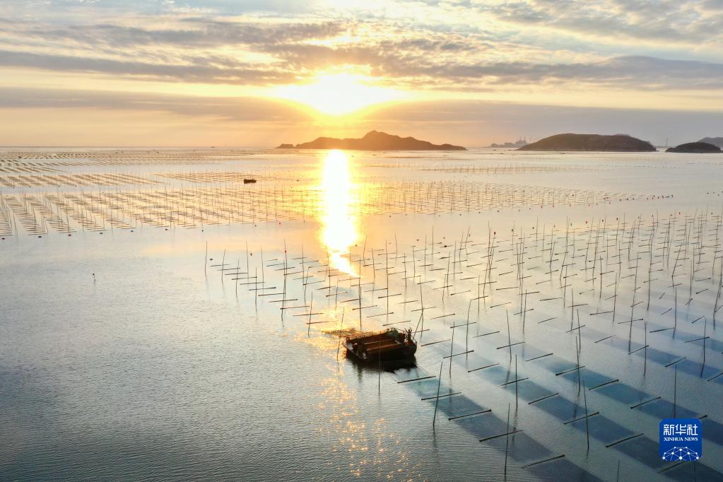 10月21日,福建省霞浦縣松山街道沙塘街村漁民在朝陽照耀的大海上收割頭水紫菜(無人機照片)。