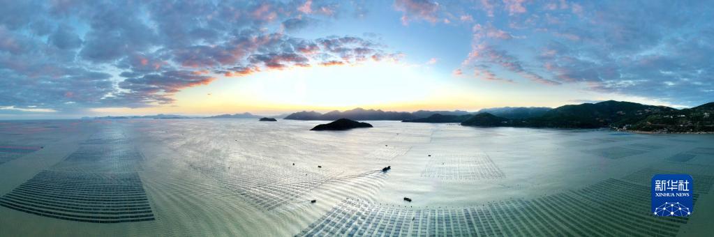金秋十月,福建省寧德市霞浦縣6.5萬畝海上養殖紫菜迎來收獲時節,漁民們操作收割船在大海中采收頭水紫菜,展開一幅海上秋收畫卷。霞浦縣素有“中國紫菜之鄉”美譽,形成紫菜育苗、種植、加工全產業鏈條,年產值近10億元。紫菜成為當地群眾增收致富的支柱產業。