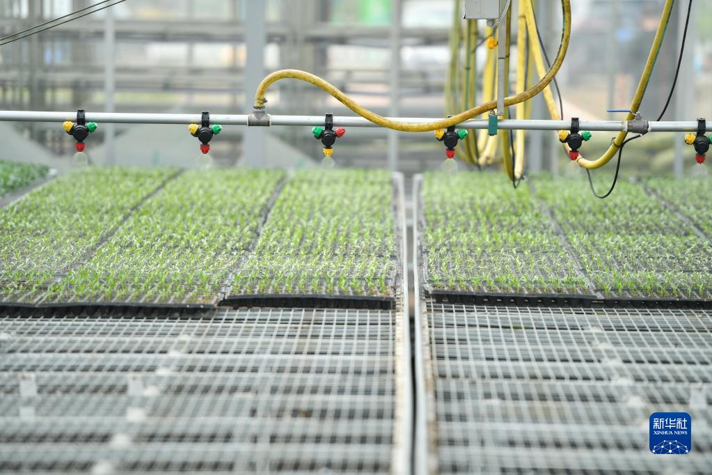 在長沙市望城區靖港鎮眾興社區的辣椒基地,智能大棚里的全自動噴淋設備給辣椒苗澆水(10月21日攝)。