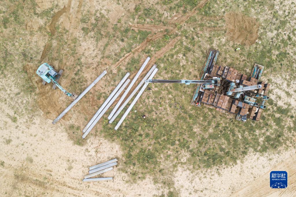 10月21日,在海南東方臨港產業園東方明陽新能源高端裝備產業基地項目工地,工人在進行樁基施工(無人機照片)。