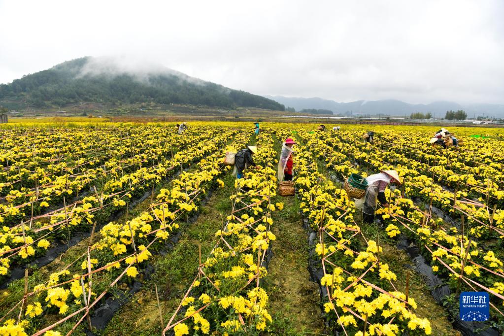 金秋時節,貴州省黔南布依族苗族自治州貴定縣云霧鎮種植的1000余畝菊花陸續進入采摘期,當地村民忙著采摘、分揀、烘干菊花,供應市場。