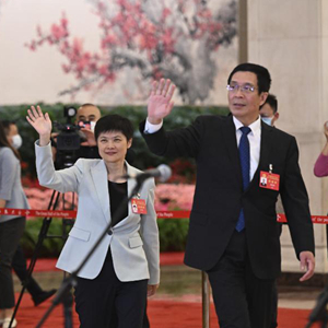 這是閉幕會后,吳燕生、朱敏、張連鋼代表(自左至右)步入“代表通道”,準備接受采訪。