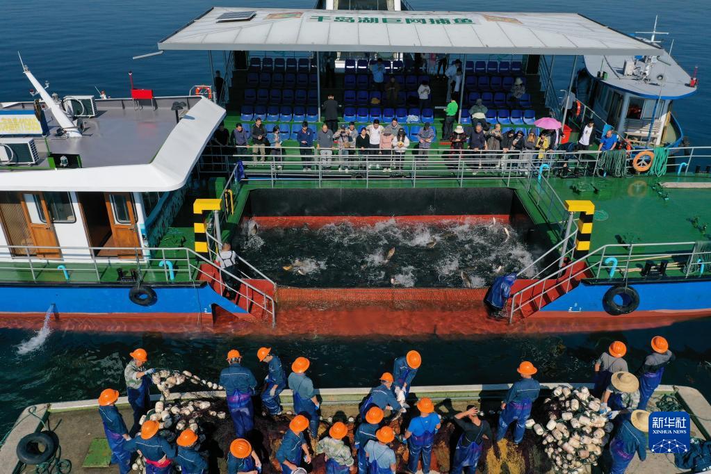 金秋時節,浙江省淳安縣千島湖黃山尖水域開展巨網捕魚,捕撈隊員合力拉網,捕獲12萬多斤鰱鳙魚,沸騰魚鄉迎來豐收季。