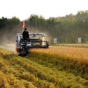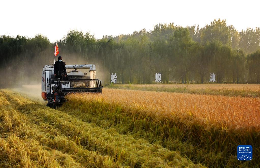 在西安市長安區王曲街道皇甫村,村民駕駛收割機收割水稻(10月21日攝)。