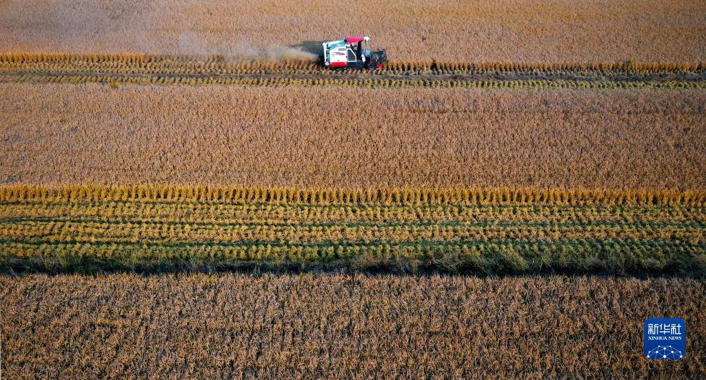 在西安市長安區王曲街道皇甫村,收割機在收割水稻(10月21日攝,無人機照片)。
