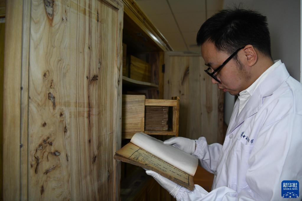 10月20日,安徽中醫藥大學圖書館古籍部主任鄧勇查看中醫古籍。