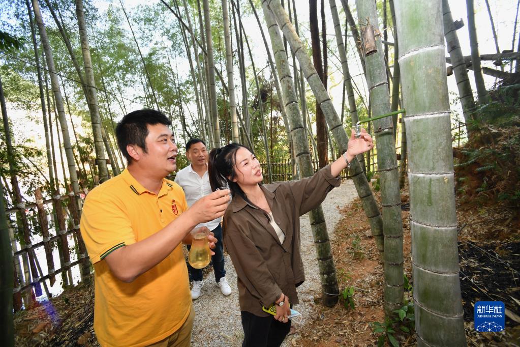 10月23日,在占西坑村竹酒生產基地,陳清(左)指導游客從竹節中取酒。