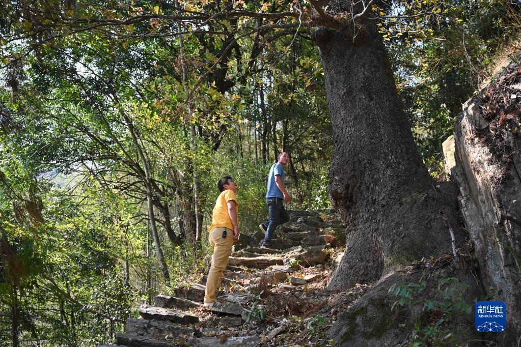 10月23日,在占西坑村后山山林,陳清(左)與一名村民查看大樹上生長的野生鐵皮石斛。