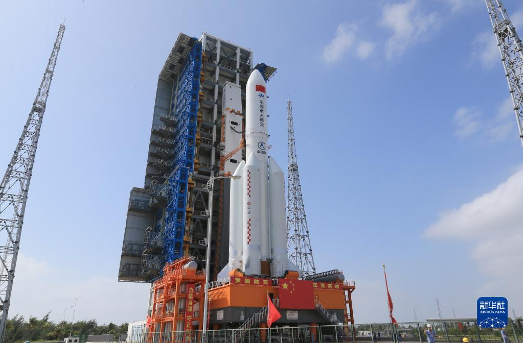 10月25日,夢天實驗艙與長征五號B遙四運載火箭組合體轉運至發射塔架。