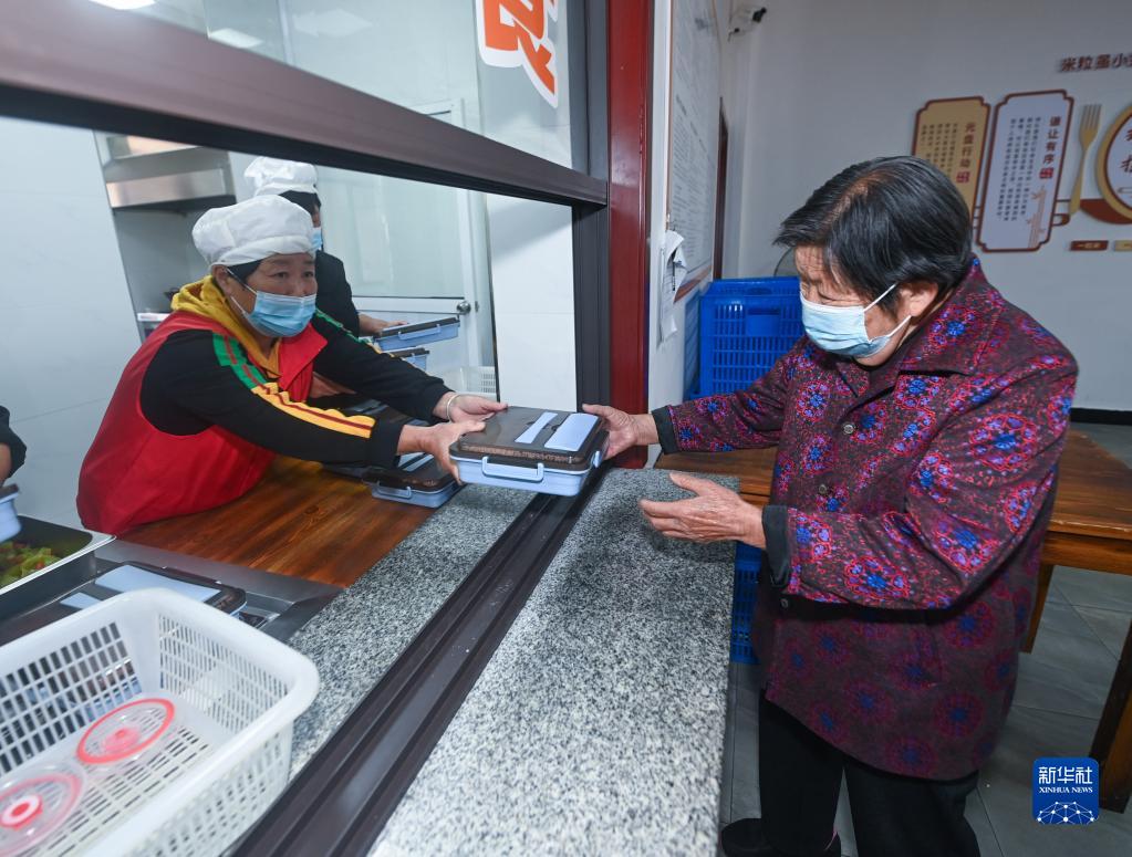 10月25日,在杭州市臨安區昌化鎮居家養老服務中心老年食堂,工作人員給老人遞上配好的午餐。