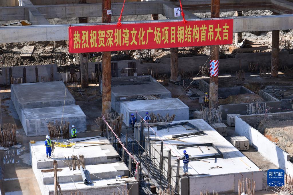 10月25日,在深圳灣文化廣場建設工地,首塊鋼結構在吊裝。