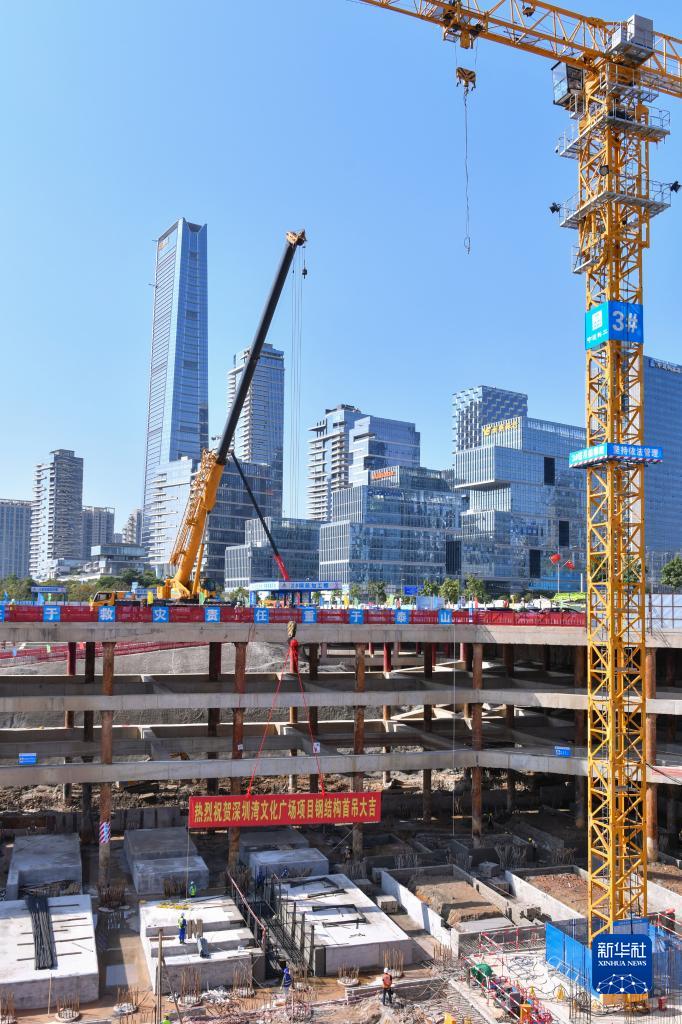 10月25日,在深圳灣文化廣場建設工地,首塊鋼結構在吊裝。