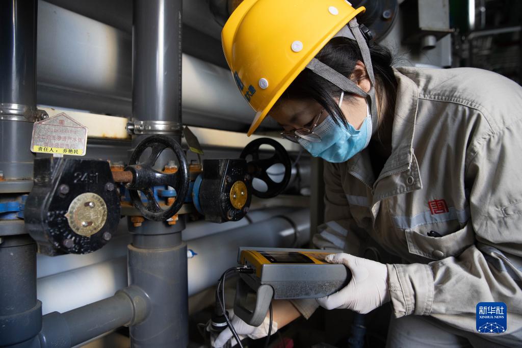 10月24日,在大唐綏化熱電有限公司供熱車間內,化驗員王蕾在進行水質檢測。