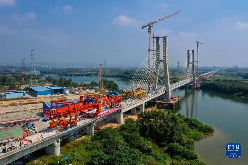 10月25日,施工人員操作架橋機將最后一孔900噸箱梁成功架設在增江特大橋橋墩上(無人機照片)。