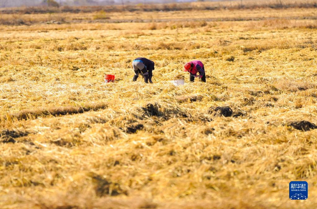10月25日,在吉林省延邊朝鮮族自治州和龍市光東村,農民在稻田間撿拾稻穗。