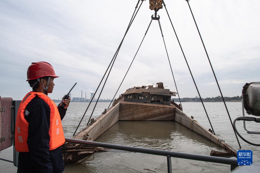 10月25日,礙航歷史沉船“二航9566”被吊出水面。 新華社記者 肖藝九 攝
