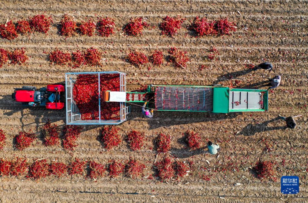 10月25日,在開魯縣東風鎮東方紅村,村民在田間收獲紅干椒(無人機照片)。