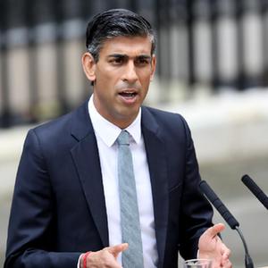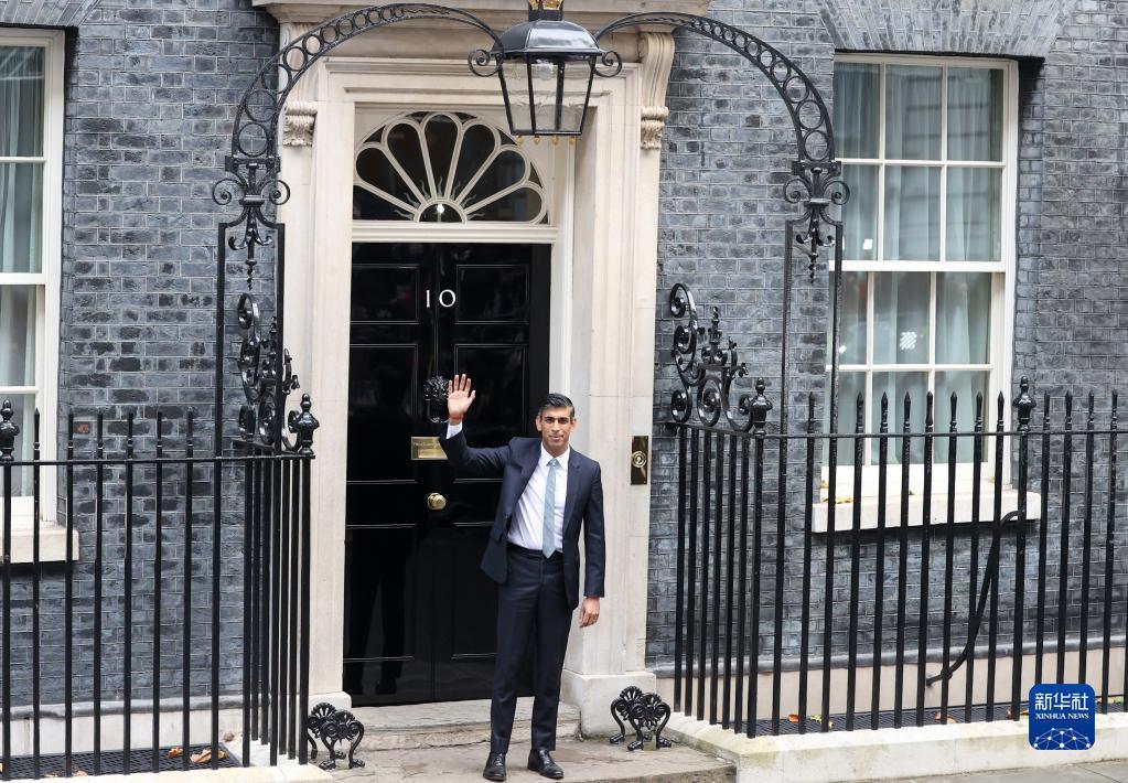 10月25日,新就任的英國首相里?!ぬK納克發表講話后在倫敦唐寧街10號首相府前揮手致意。