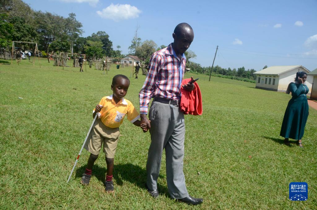 10月25日,在烏干達中部穆科諾地區一所盲人學校,火災后一名男子領著一名視障兒童行走。