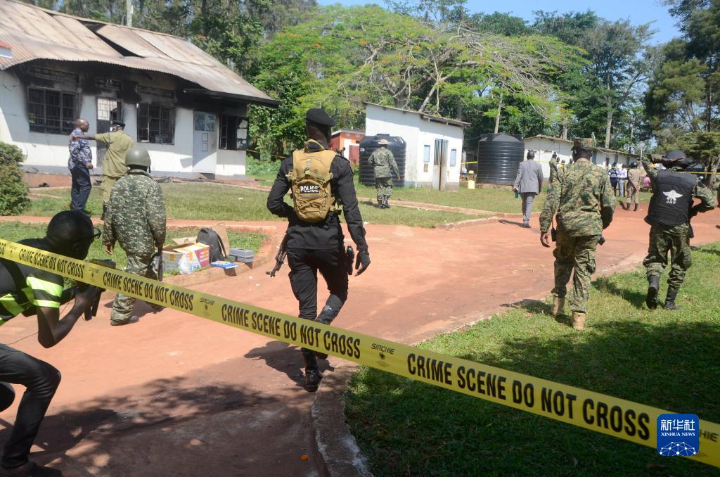 10月25日,在烏干達中部穆科諾地區一所盲人學校,安全人員在火災現場執勤。