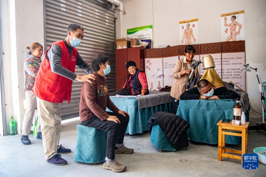 在重慶市綦江區安穩鎮崇河村“自然健康屋”,志愿者為老人提供免費理療服務(10月18日攝)?!白匀唤】滴荨笔钱數孛裾块T建立的普惠養老場所。
