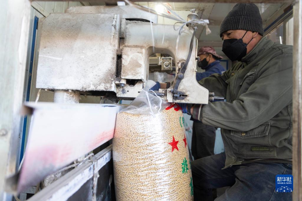 10月25日,在綏化市益盛糧食購銷有限公司內,工人打包大豆。