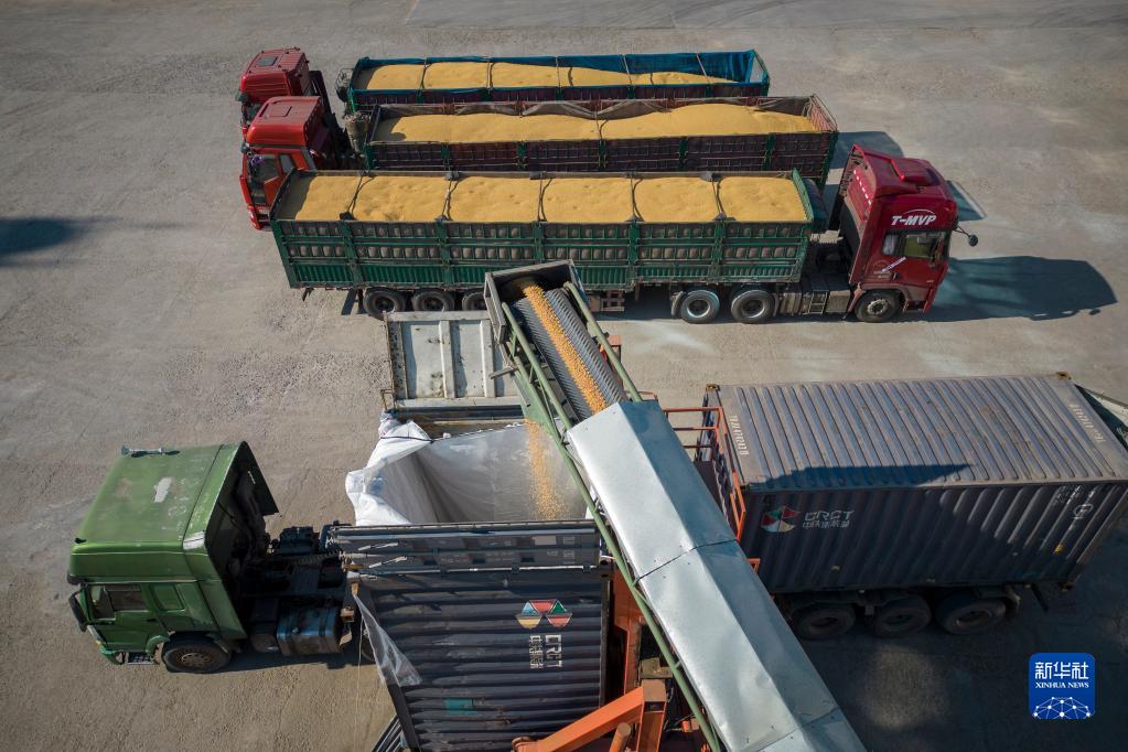 10月25日,在綏化市益盛糧食購銷有限公司內,工人利用機器將大豆裝入鐵路貨運集裝箱(無人機照片)。