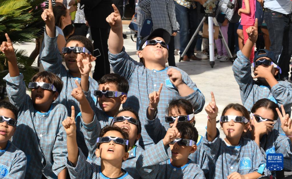 10月25日,突尼斯小學生戴著特制墨鏡在突尼斯市觀看日偏食。
