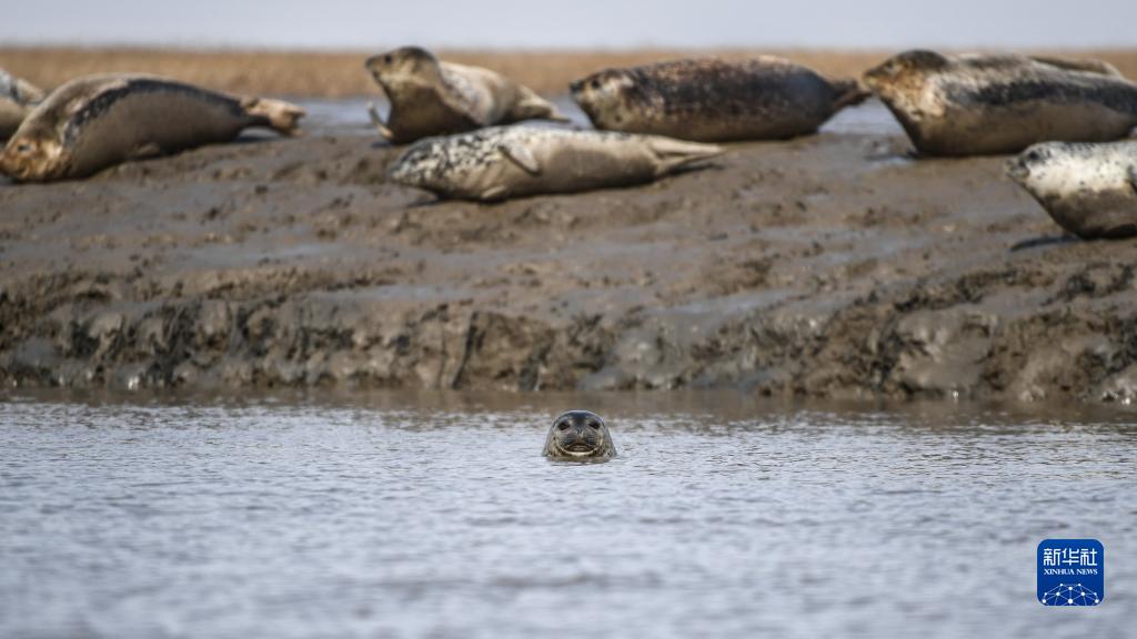 在遼寧盤錦遼河入??谌罍虾S?,一頭斑海豹從水中探出頭(2019年3月28日攝)。
