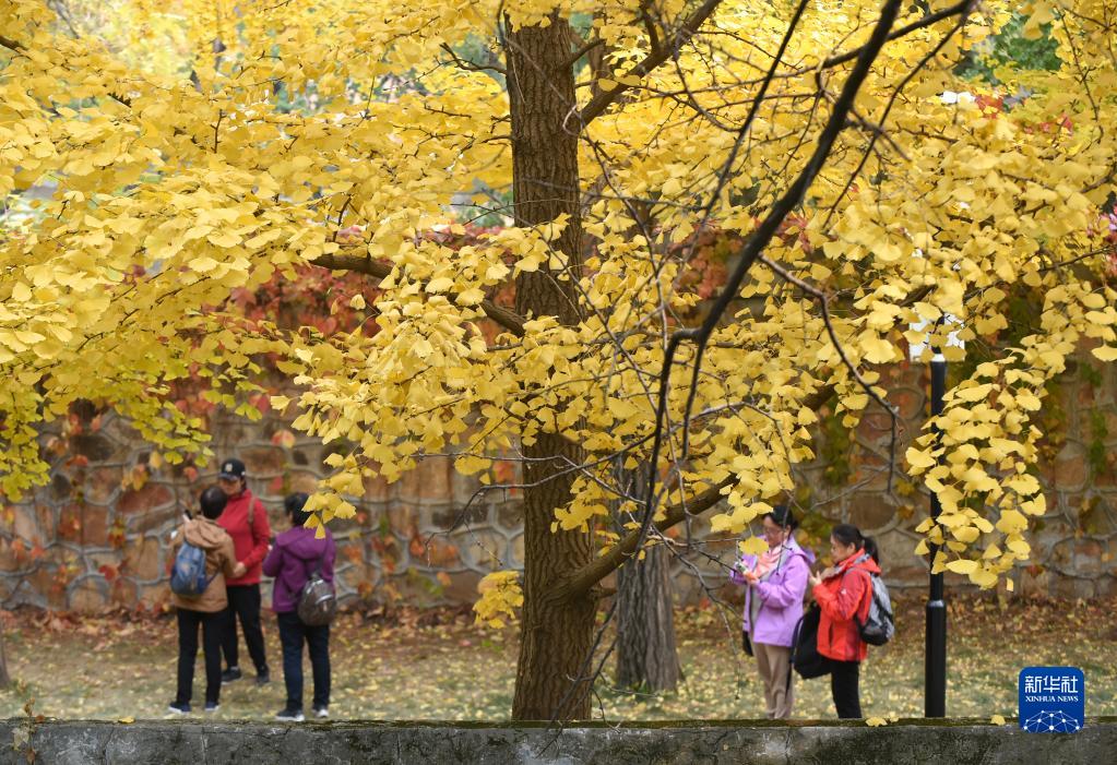 10月26日,游客在圓明園內的銀杏大道拍照。
