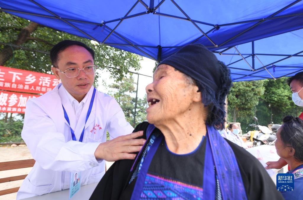 10月26日,在融水縣白云鄉幫陽村,來自廣東醫科大學附屬醫院的周仲佑博士(左)在給老人提供醫療服務。