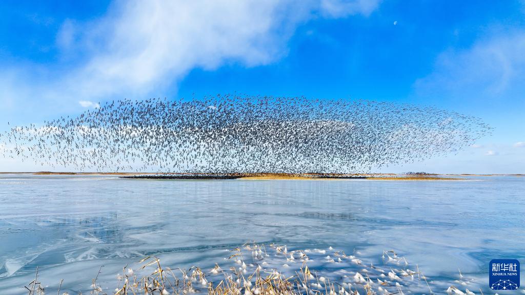 這是2021年12月25日在山東黃河三角洲國家級自然保護區拍攝的鳥群(無人機照片)。