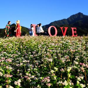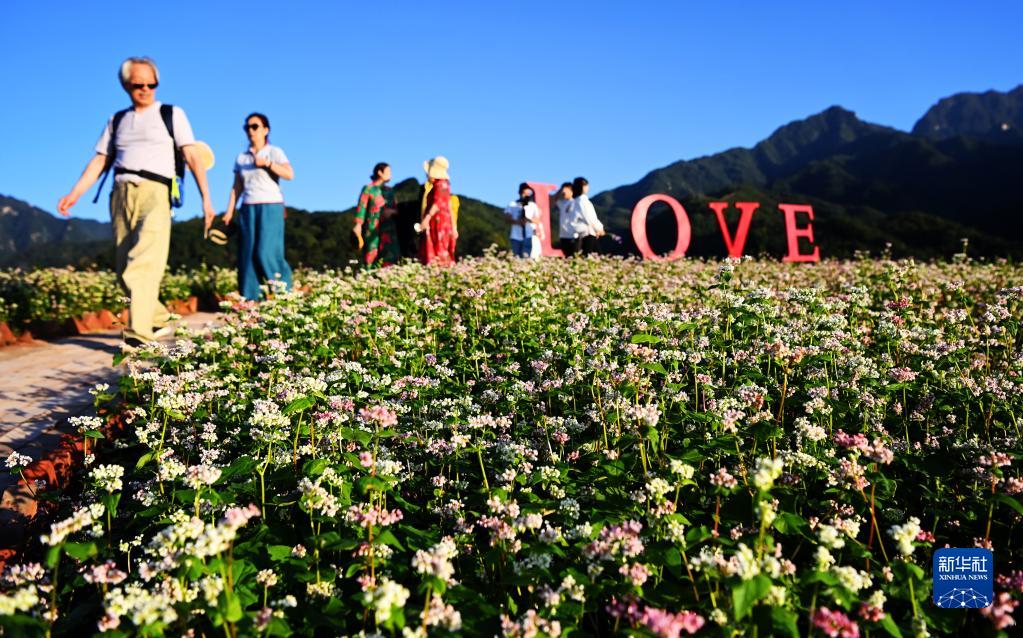 游人在西安市藍田縣九間房鎮峪口村蕎麥花海農業景區游覽(9月28日攝)。
