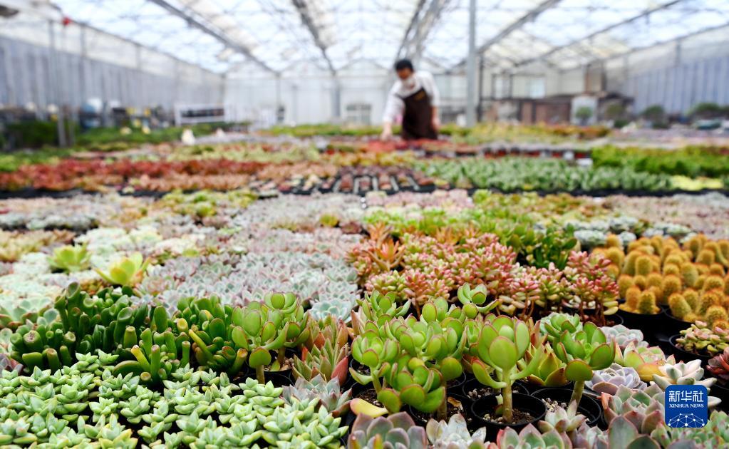 工作人員在西安市長安區秦嶺花世界農業景區的多肉植物溫棚里管護植物(10月26日攝)。