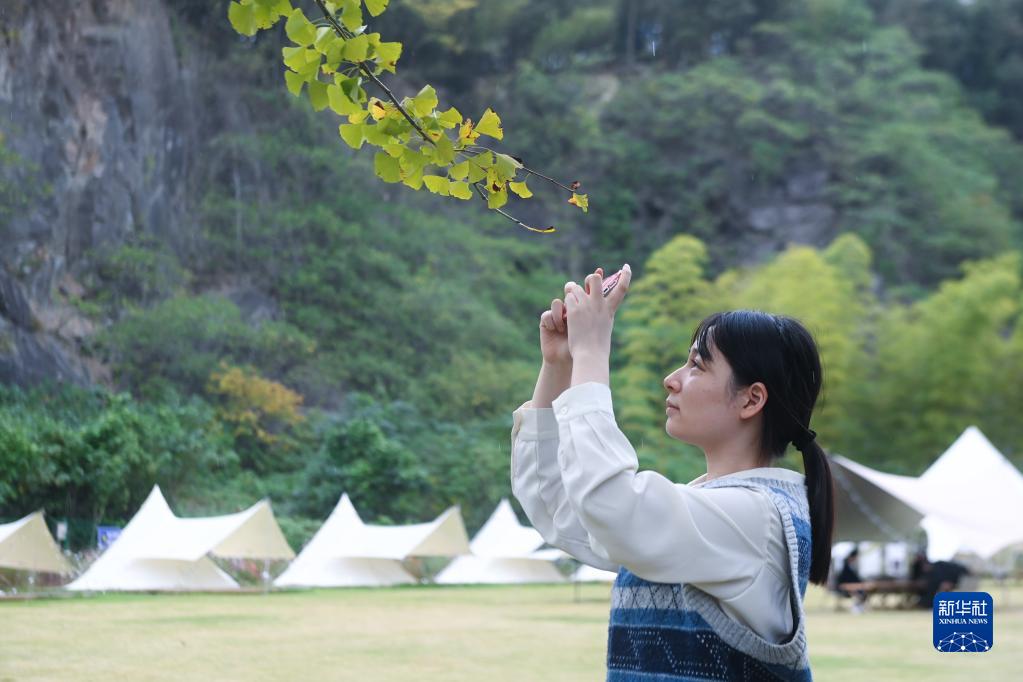 10月26日,游客在位于紅里山村的森林浬礦坑露營地里拍照打卡。這個營地是利用廢棄礦坑建造的,能為游客提供露營帳篷等休閑娛樂設施 。