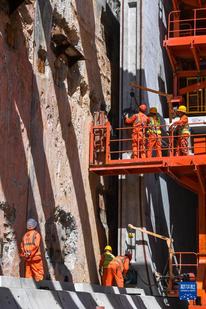10月26日,在深圳地鐵華夏站施工現場,中國電建的作業工人對構件進行微調張拉、精準就位。