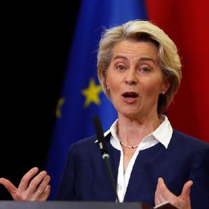 10月26日,在北馬其頓斯科普里,歐盟委員會主席馮德萊恩在與北馬其頓總理科瓦切夫斯基(不在畫面中)舉行的聯合新聞發布會上講話。